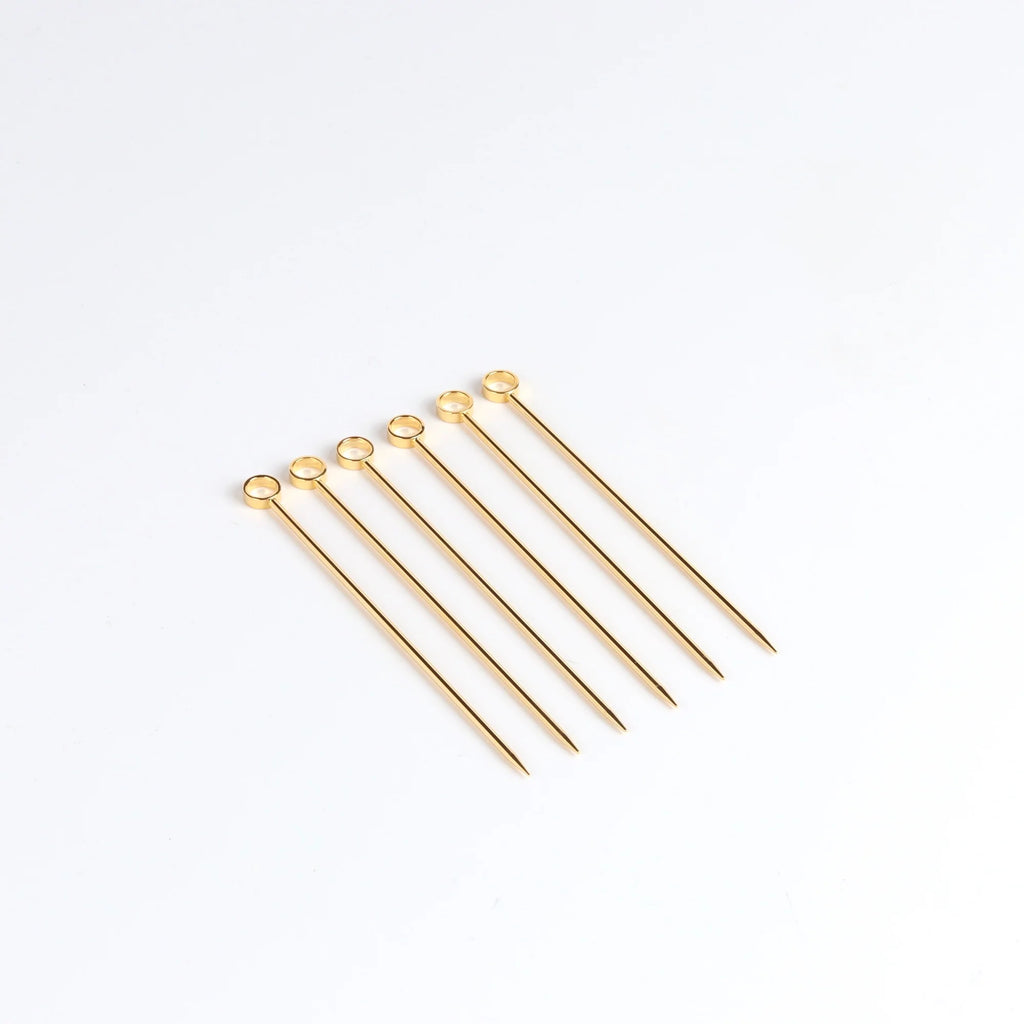 Gold plated gold circle cocktail picks sold as a set of six. Made in Japan.