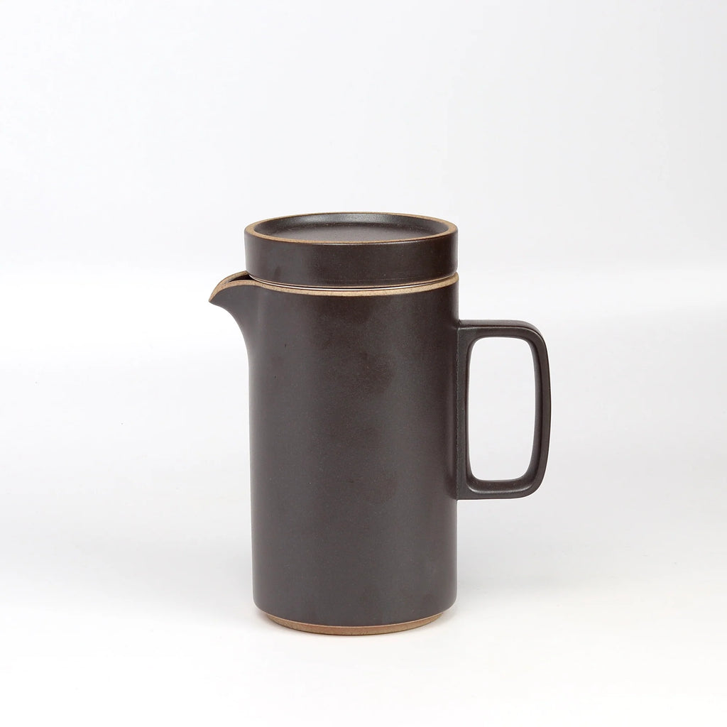 Matte black glaze over medium brown porcelain with raw exposed edges. Simple, durable and functional, the Hasami teapot comes with a stainless steel infuser that is easily cleaned. Dishwasher and microwave safe, but not intended for stovetop use. Made in Nagasaki Japan.