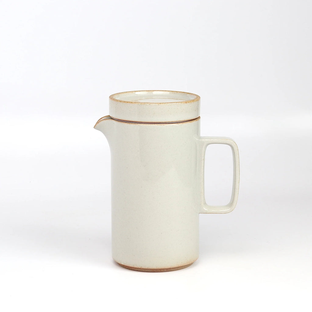 Gray semi-gloss, semi-transparent glaze over medium brown porcelain with raw exposed edges. Simple, durable and functional, the Hasami teapot comes with a stainless steel infuser that is easily cleaned. Dishwasher and microwave safe, but not intended for stovetop use. Made in Nagasaki Japan.