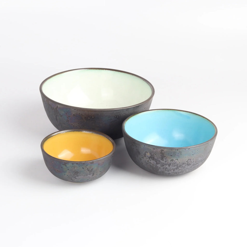 This set of three round ceramic accent bowls has a special outer glaze that is made by mixing in ash from the Sakurajima volcano in Kagoshima. These extra small, small and medium bowls stack beautifully. The colors are ash and white, ash and yellow, and ash and blue. Made in Kagoshima, Japan.